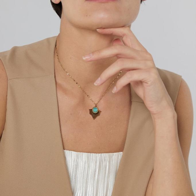 Colar pendente raios solares com pedra natural azul e banhado a ouro 18k. Acessório cheio de elegância e sofisticação, com um visual arrojado é ideal para compor um look mais elegante e cheio de estilo. Item indispensável para uma mulher independente e confiante.